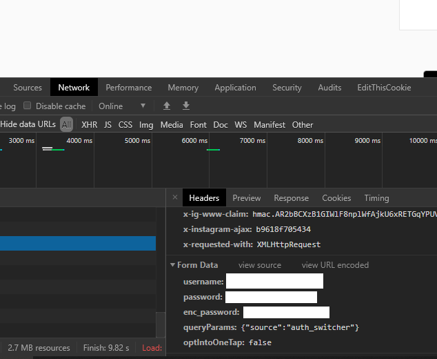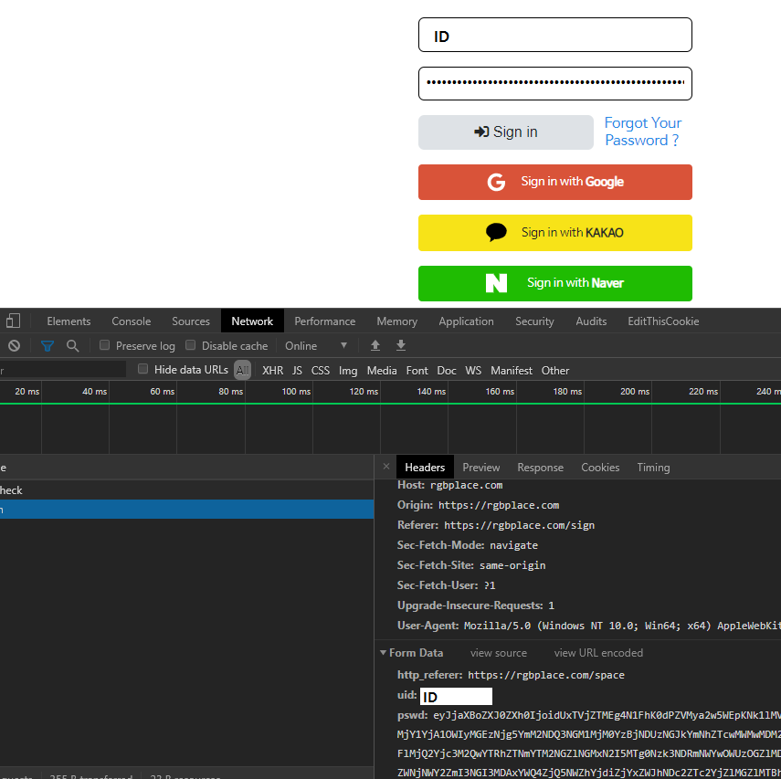 네이버의 경우 로그인 할때 마찬가지로 id와 패스워드가 보이지 않는 듯 하다.