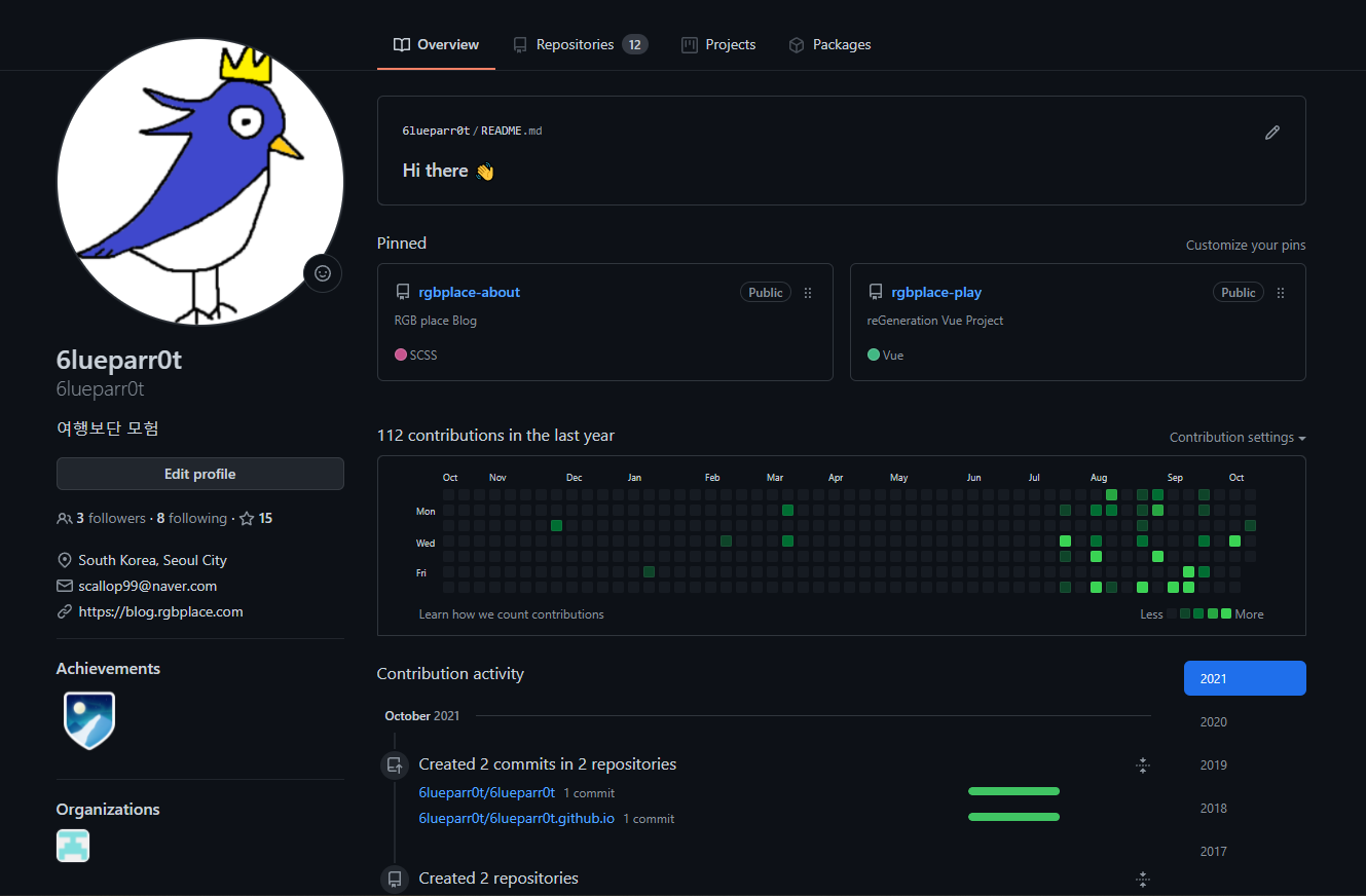 소위 말하는 잔디밭을 포함해 Github 에서는 이런식으로 개발자가 평소 어떤 활동을 했는지 보여주는 프로필 화면이 있다.