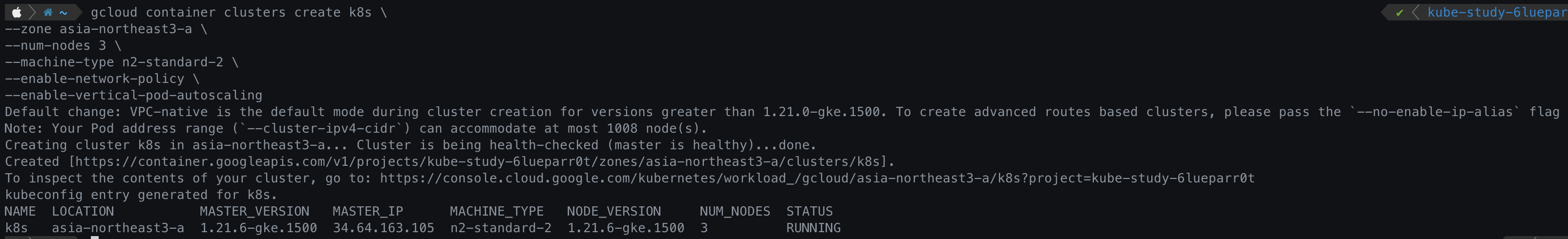 # --cluster-version 1.21.5-gke.1802 \ #validMasterVersions에 있는 쿠버네티스 버전 지정