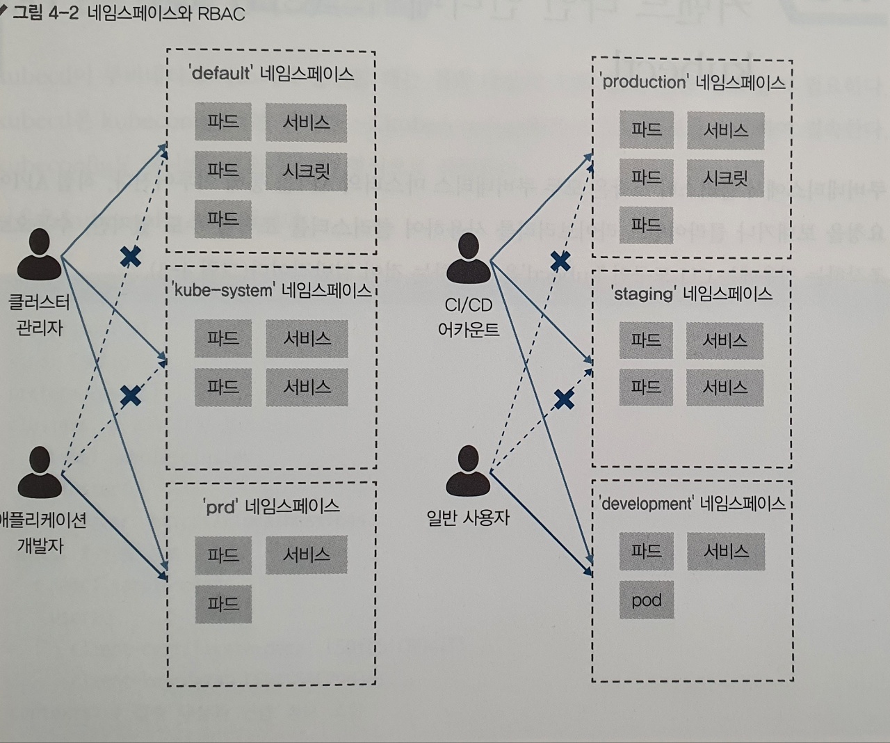 쿠버네티스 클러스터는 RBAC (Role-Based Access Control) 가 기본값으로 활성화되어 있다. 클러스터 조작에 대한 권한을 네임스페이스 별로 구분할 수 있고, 네트워크 정책과 사용하여 네임스페이스 간의 통신을 제어할 수 있는 구조다.