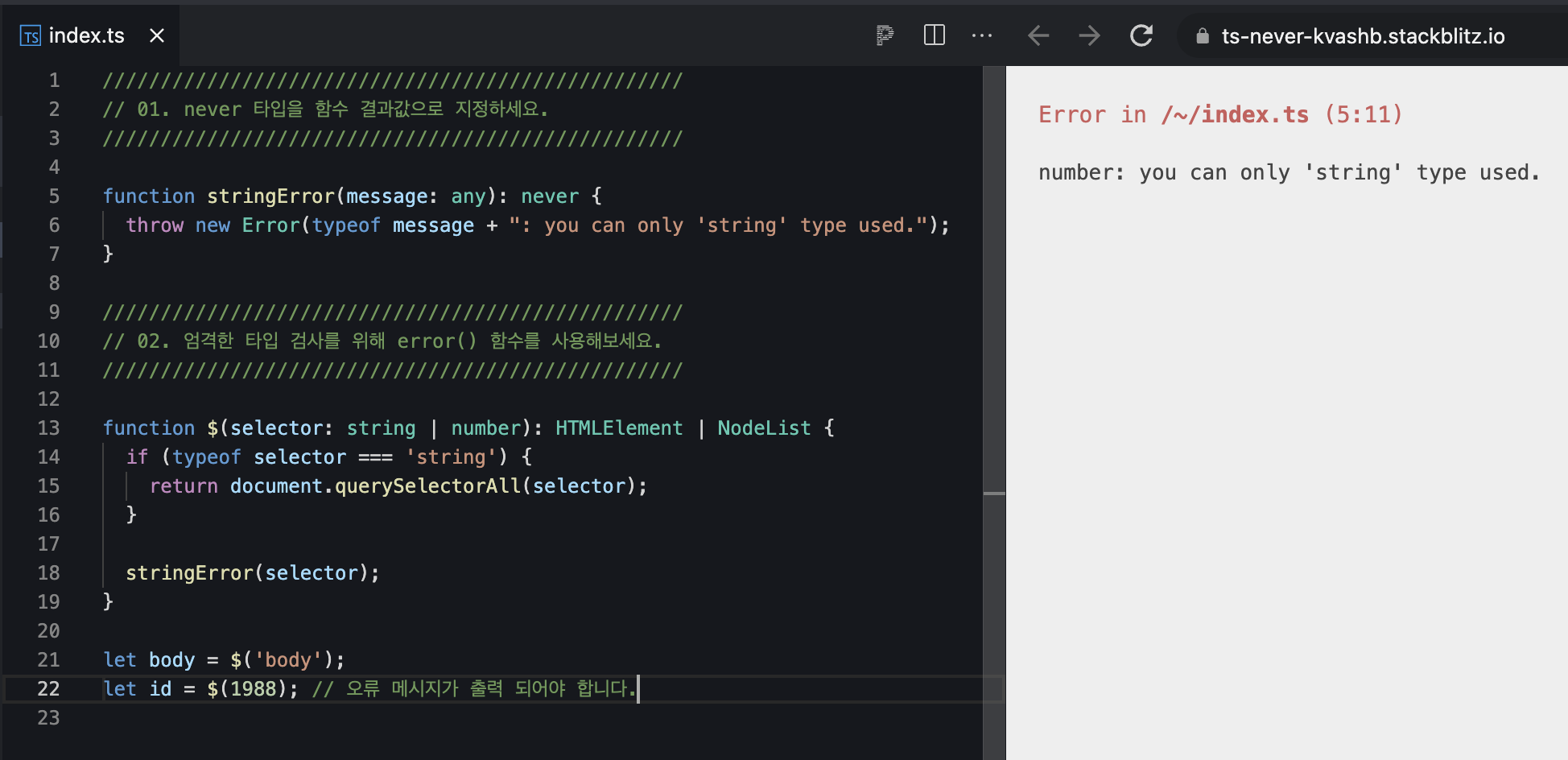 // 02. 엄격한 타입 검사를 위해 error() 함수를 사용해보세요.
